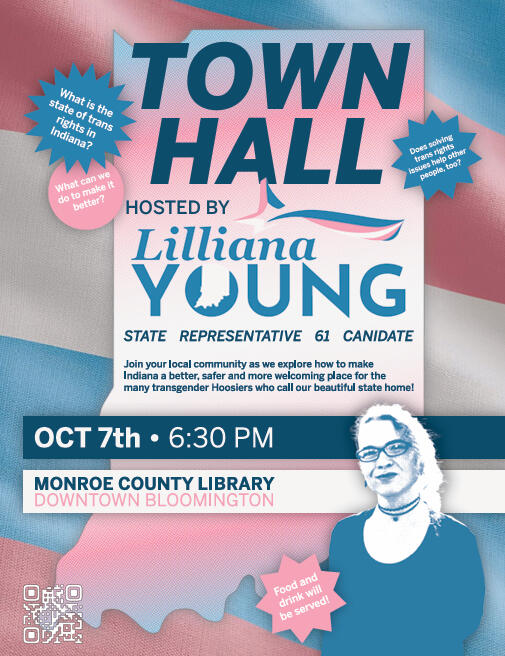 9/23/2025My first official campaign event will be on October 7th, 6:30 pm at the Downtown Bloomington Library auditorium!A town hall on the state of trans rights in Indiana: What can we do to make it better? How do trans rights intersect with other issues? Join me and let's talk about it! Food and drink will be on hand, too, just in case you have to skip dinner to be there. Check out the event flyer below!