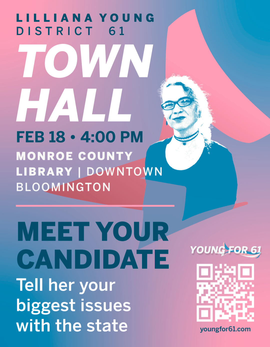 Wed Feb 18!Join my Townhall at the Downtown Bloomington Library beginning at 4pm! Come meet me in person, learn more about me, and tell me about your concerns with, and hopes for, the state of Indiana!